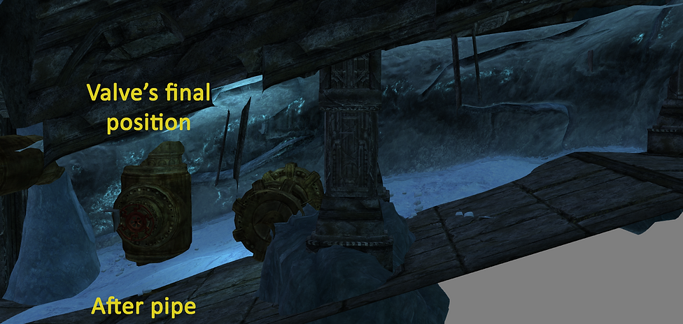 The second half of the level presents new puzzle pieces, with which players have to interact in order to progress. As the new areas have the Dwemer architecture, I used its golden color in contrast with the white of the ice caves for highlighting interesting pieces. Along those lines, every interactive artifact (activators such as levers, buttons, pressure plates) also belongs to the Dwemer style, drawing from previous Skyrim’s knowledge that players could possibly have.